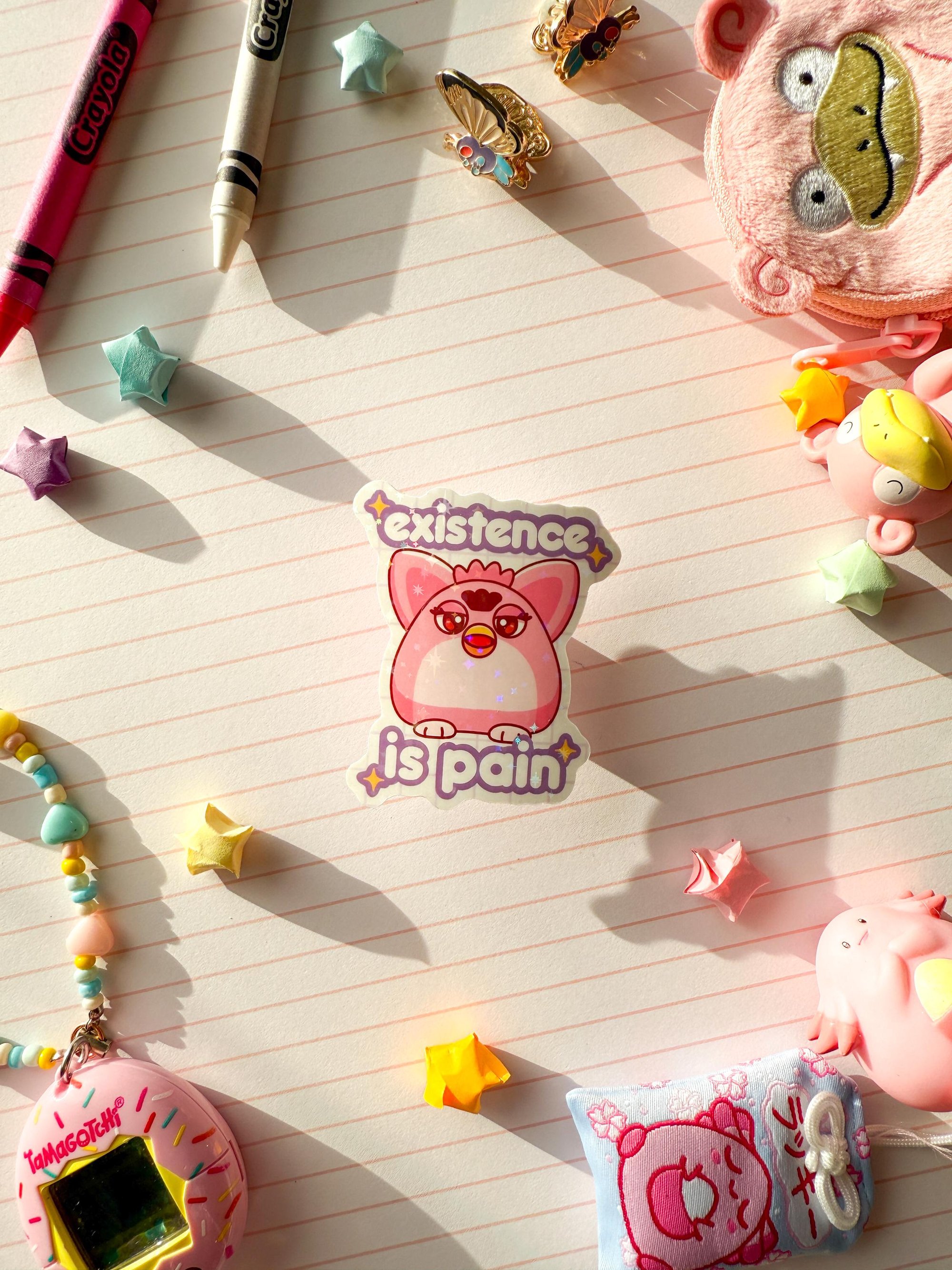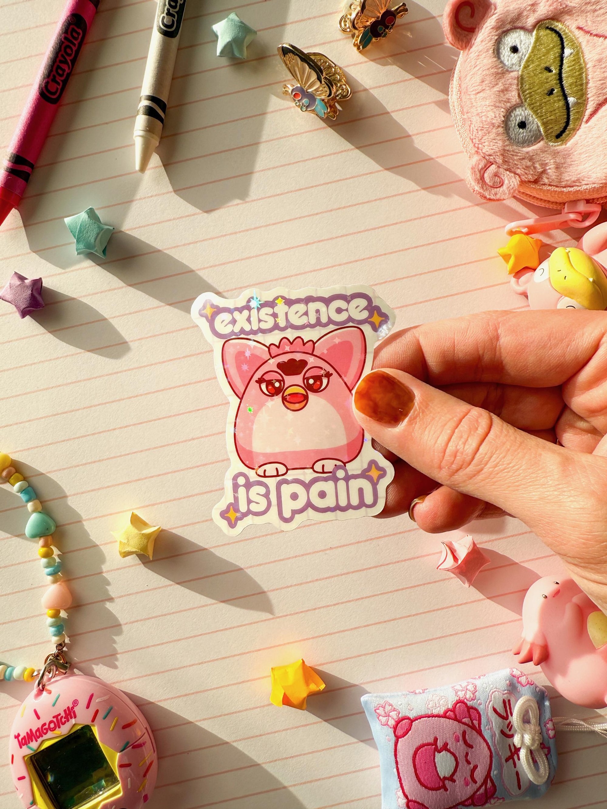 Ultra Glossy Glitter Furby Existence is Pain Vinyl Sticker