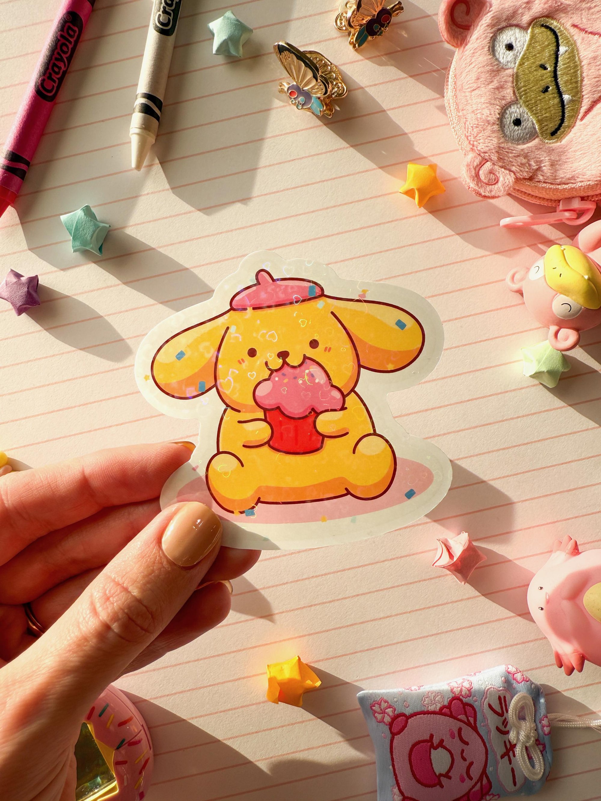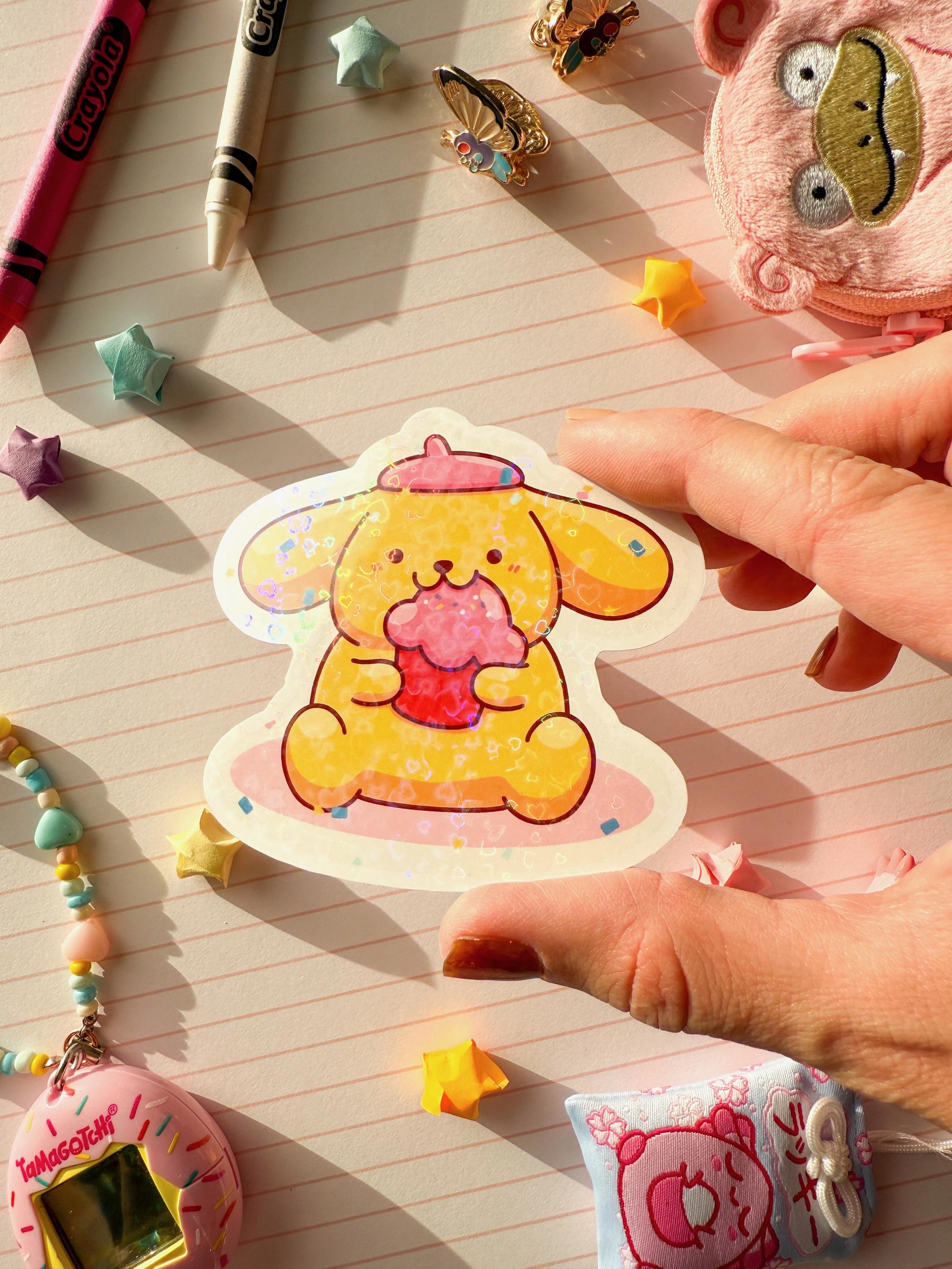 Holographic Glitter Pompompurin eating a cupcake Sticker! Great for laptops, notebooks, anything you put stickers on!